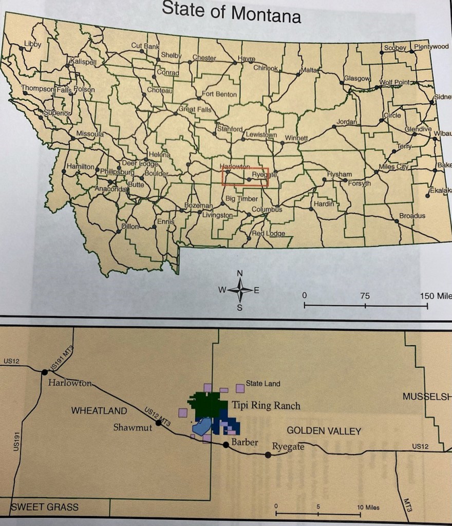 The Tipi Ring Ranch, consisting of the conjoined Rimrock and Barber Valley ranches, comprise approximately 11,000 acres straddling Wheatland and Golden Valley counties in the vast hay, grass, and wheat lands of north central Montana. The footprint of the Tipi Ring Ranch includes Indian camping, hunting, and battle grounds; a buffalo jump; the remnants of early homesteader settlements; a one-room school house; the outer traces of several ghost towns; and the settings for two big-budget Hollywood movies. Over the course of time, the ranch was traversed by Chief Joseph of the Nez Perce, Lewis and Clark, Kit Carson and Jim Bridger; any number of hunting and marauding Crow, Blackfeet, and Cheyenne Indians, and more recently by the likes of Tom Cruise and Nicole Kidman. The winds that sweep across the land serve to make it a natural grasslands, and have reduced the footprints and traces of human history to a minimum. But the cultural and ecological record is clear, and the memories of second and third generation settlers still residing in and around the ranch are likewise fresh and rich in detail.